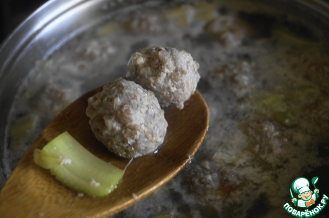 В кипящую воду или бульон выложить фрикадельки и сельдерей, готовить 10 минут. -