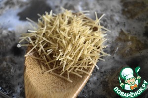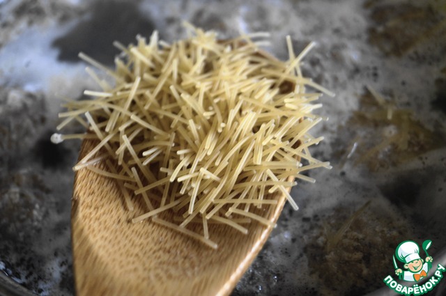 Затем всыпать вермишель и добавить зажарку, готовить до готовности вермишели.