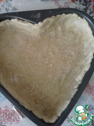 Тесто раскатать в тонкий пласт и выложить в форму, смазанную маслом. Наколоть вилкой и поставить в холодильник ( пока готовится начинка).