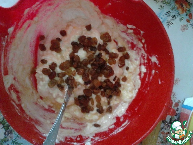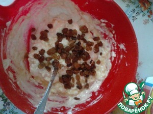 Добавить творог, изюм. Перемешать.