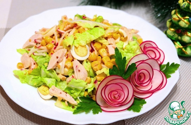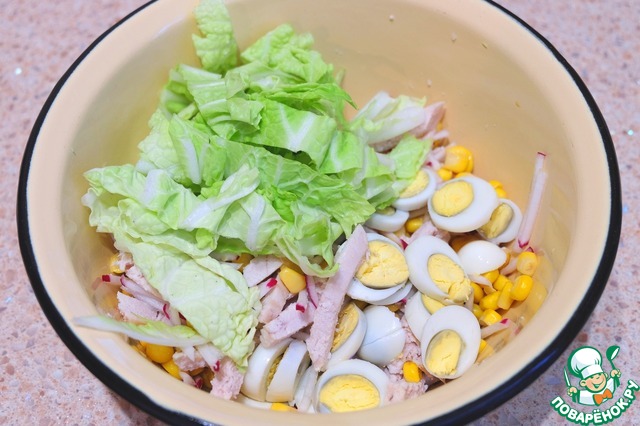 Куриную грудку отварить, порезать брусочками. Отварные перепелиные яйца порезать кружочками. Нашинковать на корейской терке редис. Порезать пекинскую капусту.