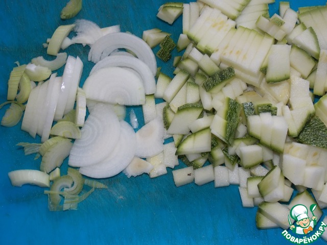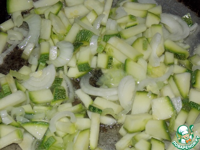 Лук и цуккини обжарить на растительном масле в течении 5-7 минут.