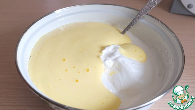 Отделить белки от желтков. Постепенно взбивая ввести в белки сахар. Взбивать до стойких пиков.