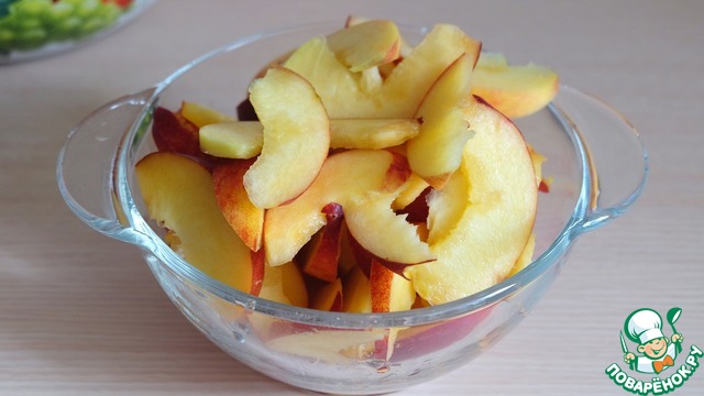 Порезать дольками персики.