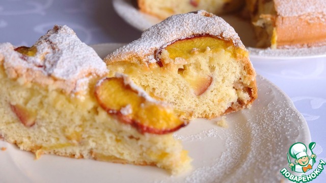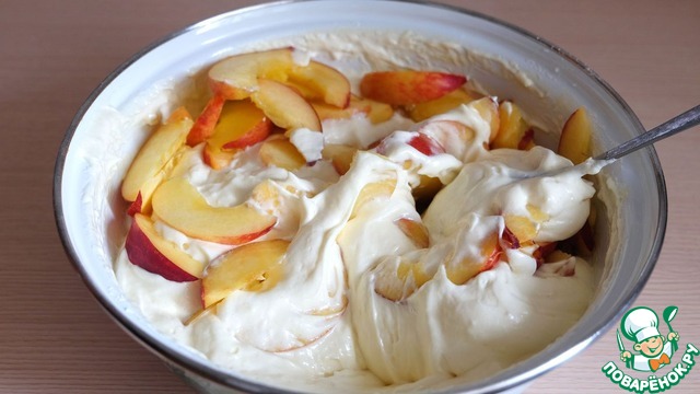 Добавить дольки персиков в приготовленное бисквитное тесто.