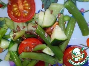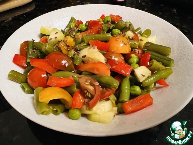 Выкладываем на блюдо, посыпаем семенами льна, перчим и приправляем бальзамическим уксусом и лимонным соком. Можно также приправить соевым соусом или оливковым маслом.
