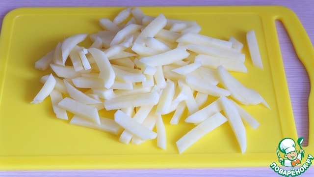 Пока грибы тушатся, картофель почистить, нашинковать соломкой.