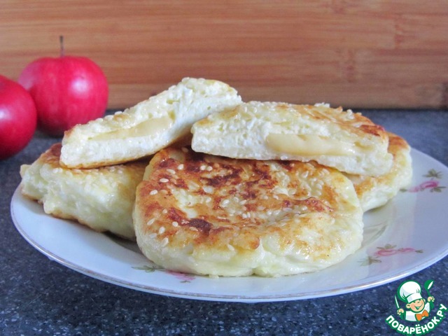 Формируем лепёшечки, в середине которых кусочек сырка. Обваливаем в кунжуте.