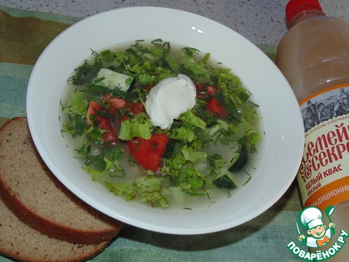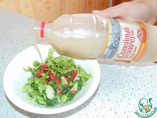 • Перемешать, залить квасом Семейный секрет, при необходимости посолить и заправить сметаной.