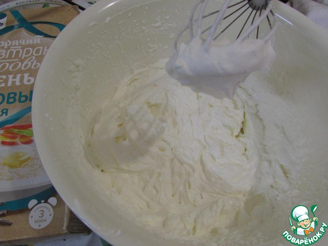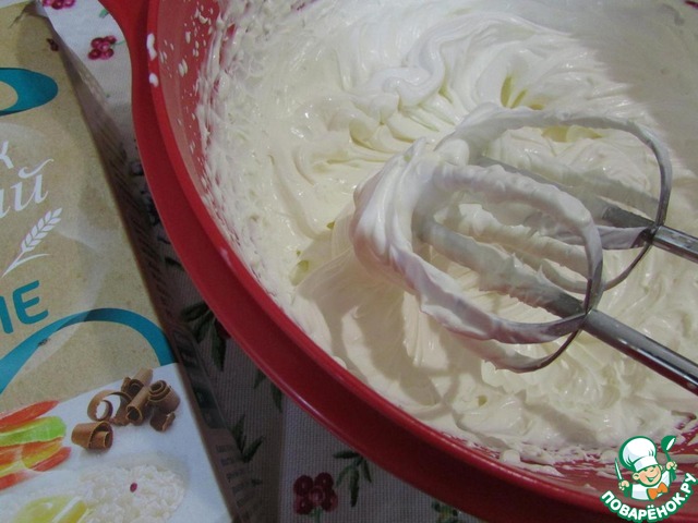 В отдельной миске взбить 300 мл сливок до устойчивых пиков.