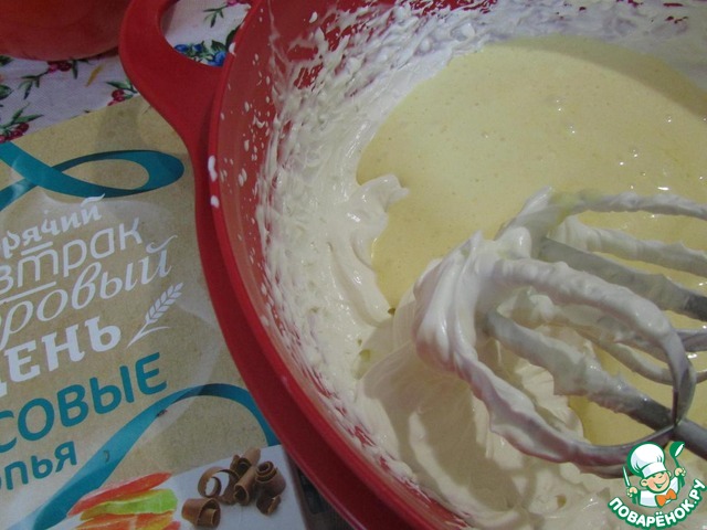 Аккуратно смешать массу из сливок и маскарпоне с яичными желтками.