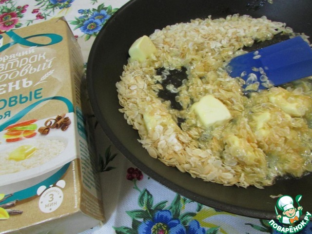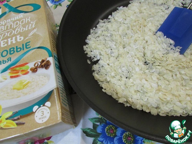 На сухой сковороде обжарить Рисовые хлопья Мистраль до слегка кремового цвета. -
