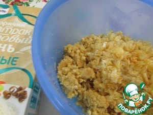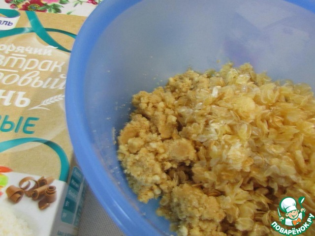 В миске соединить крошку из печенья, сливки, размягченное сливочное масло (50 грамм) и хлопья.