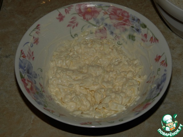 • Для начала мелко нарезать лук, посолить, сбрызнуть яблочным уксусом. добавить сметану и размешать.