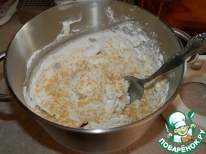 Стружку тёртого яблока, шоколад и хлопья добавить к взбитым белкам и очень осторожно перемешать ложкой – сверху вниз.