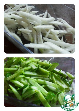 Дайкон вначале почистить и натереть на терку. Так же поступить с огурцом.