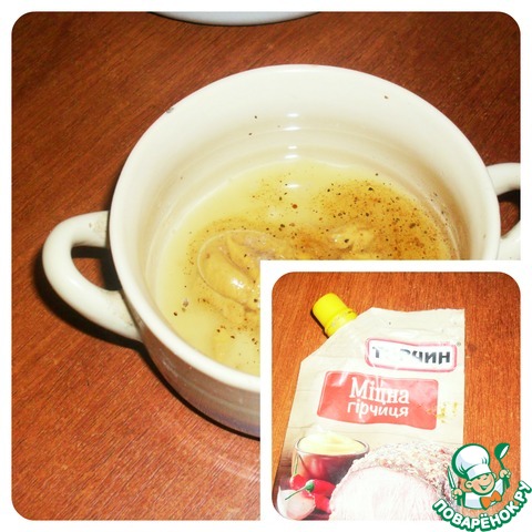 Приготовим заправку. Смешать горчицу, соль, смесь перцев, уксус и масло.