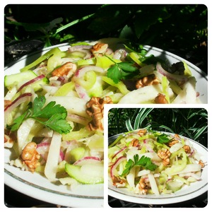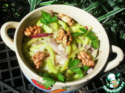 Поскольку я стала заядлым дачником-огородником, то и читаю соответствующую литературу. И, как ни странно, часто в таких журналах ("Садовод и огородник","Моя прекрасная дача" и. т. п.) натыкаешься на рецепты, которыми делятся читатели. Вот и в очередной раз, увидела рецепт этого незатейливого салатика. Благо все ингредиенты имелись под рукой, приготовила. Салат в оригинале назвался "Свежесть", но под таким названием их на сайте много. Поэтому, да простит меня автор, я его переименовала. Салат получается свеже-бодрящим. Пикантность салату придают горчица и болгарский перец.