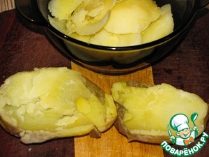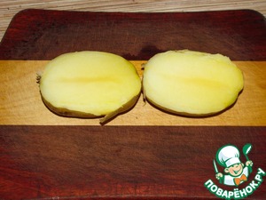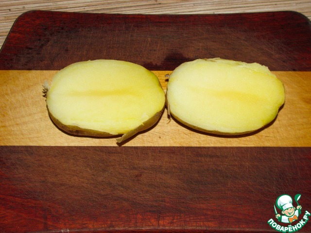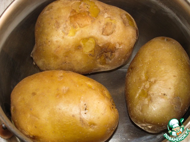 Крупный картофель заранее отварить в мундире, остудить. На одну порцию достаточно 1 шт.