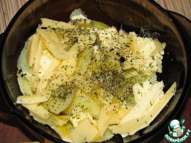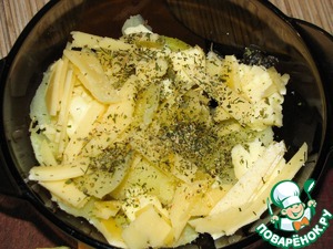 К вынутой части добавить сливочное масло, мелко порезанный сыр, соль, сушеный чеснок и травы. Сделать пюре.