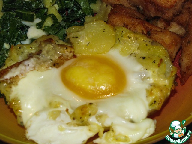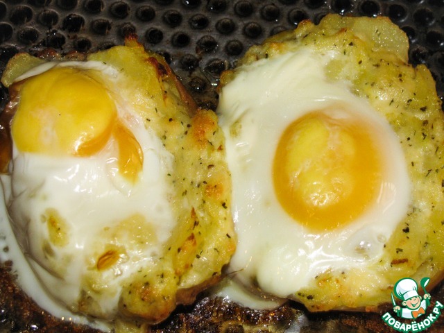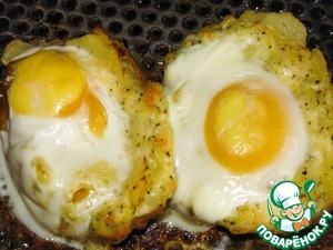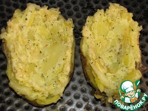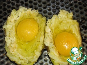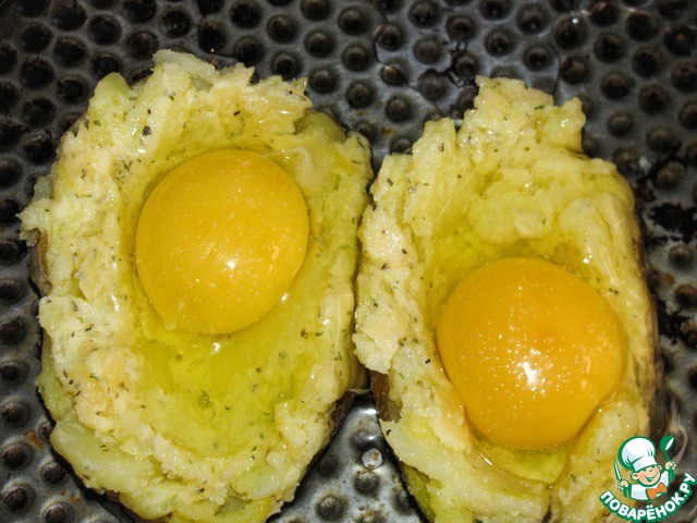 Аккуратно "вмять" получившуюся массу обратно в картофель, оставляя выемку для яичницы и делая бортики, чтобы яйца не вытекли.