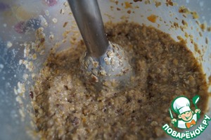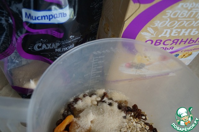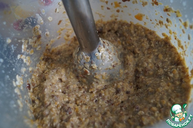 • Выкладываем в блендер, добавляем сахар или мёд и овсяные хлопья.