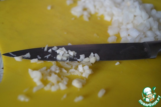 Мелко порезать лук и ножом мелко порубить чеснок.