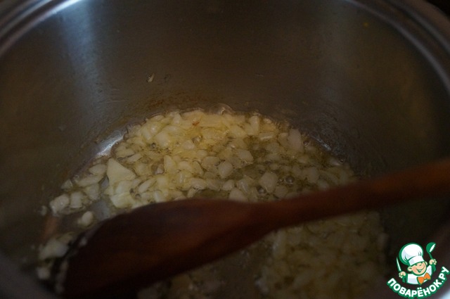 На сливочном масле в толстостенной кастрюльке, помешивая, пассеруем лук и чеснок.