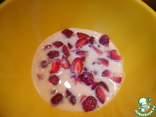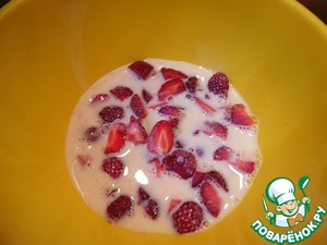 Клубнику хорошо промыть, избавить от плодоножек, нарезать, залить соевым молоком.