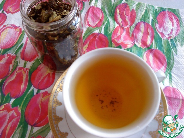 На этом фото смесь чая из листьев малины, яблони и груши.