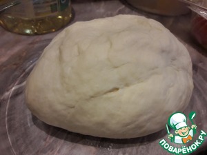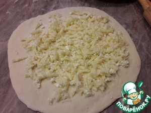 Присыпать рабочую поверхность чуть мукой и раскатать из шарика лепешку. Сверху распределить начинку немного не доходя до края. Затем свернуть два противоположных края в трубочку, формируя бортики. Начинка должна находится внутри бортиков.