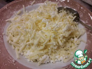 Сыр натереть на крупной треке. Смешать с творогом. Если начинка суховата, растопить сливочное масло и добавить к начинке, хорошо перемешать. -