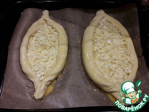 На противень выстрелить бумагу для выпечки. Переложить готовые лодочки на противень. Расширить немного серединку и добавить ещё начинки. В миске взбить одно яйцо и смазать тесто.