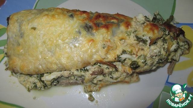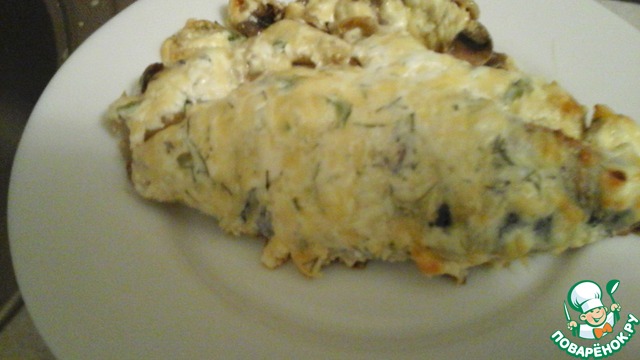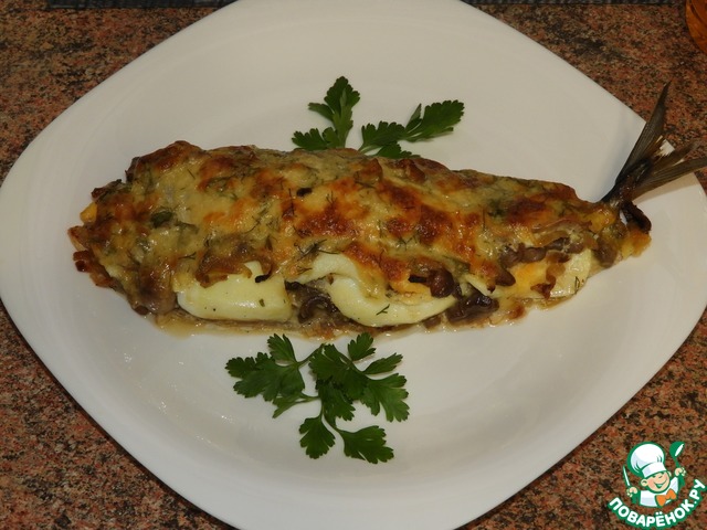 Поверх сыра, на одну половину рыбы, выложить часть грибов.