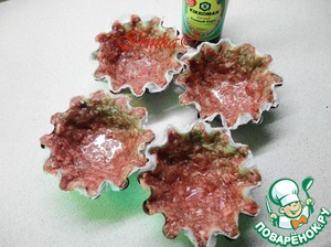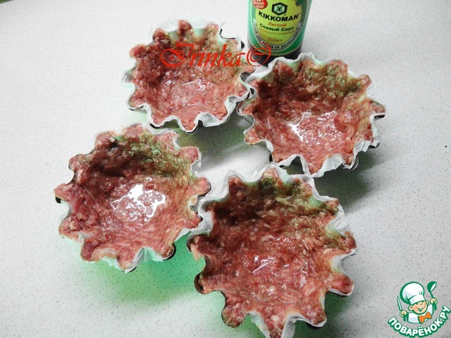 Распределяем фарш по порционным кексовым формочкам, смазанным маслом (я еще дополнительно вставляю внутрь бумагу для выпечки), формируя корзинки, и ставим их в разогретую до 190 градусов духовку на 20 минут. -