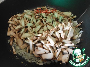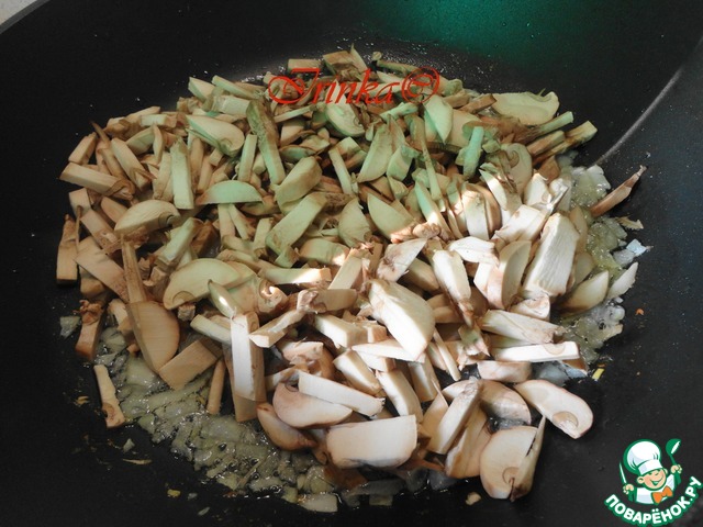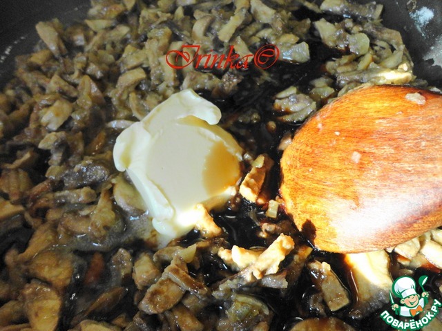 В это время мелко режем лук, обжариваем его на сковороде в смеси растительного и сливочного масла, добавляем мелко нарезанные шампиньоны и обжариваем вместе с луком до испарения жидкости.