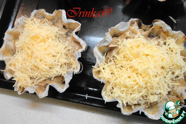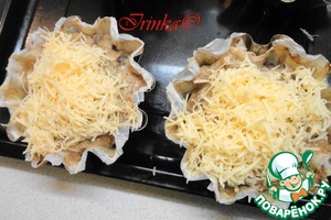 Достаем из духовки фаршевые корзиночки и, не вынимая их из формочек, заполняем грибной начинкой.