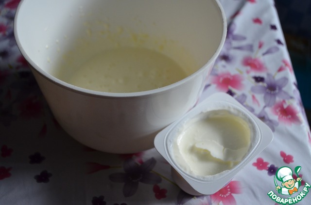 В желтки добавляем 1 баночку (170 г.) творожка.