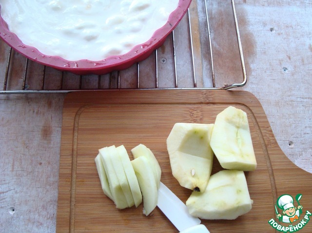 Берём яблоки и чистим их от шкурки, вынимаем серединку и режем пластинами.