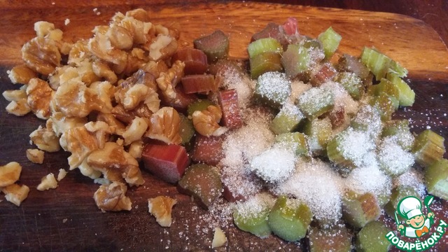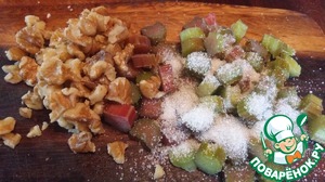 Ревень почистить, мелко порезать и посыпать сахаром, орехи крупно порубить. Сливу разрезать пополам, косточку удалить.
