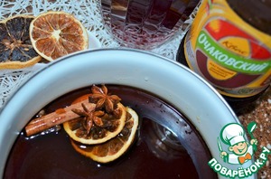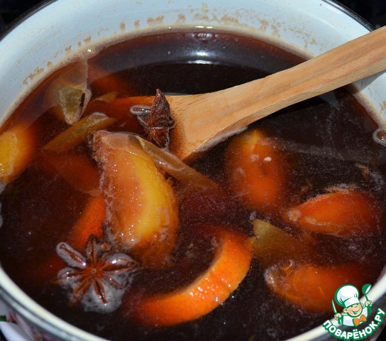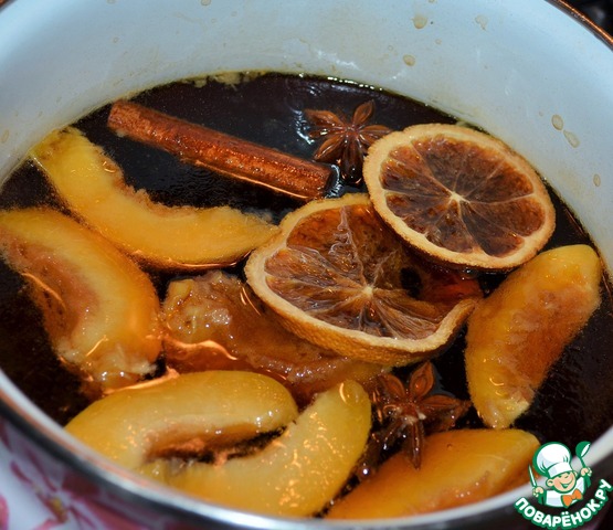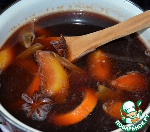 Добавить бадьян, корицу, перец, гвоздику и сушеные кольца лимона и апельсина.