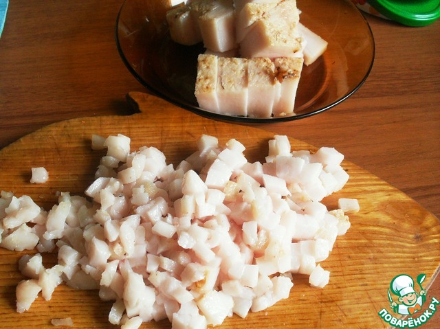 Отварить крупу. Большую часть сала (грамм 350) порезать крупно. Меньшую часть маленькими кубиками.
