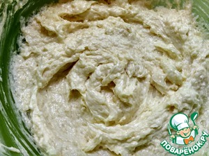 Мягкое сливочное масло взбить с сахаром, добавить яйцо, рисовые хлопья (муку) и взбить до однородности
