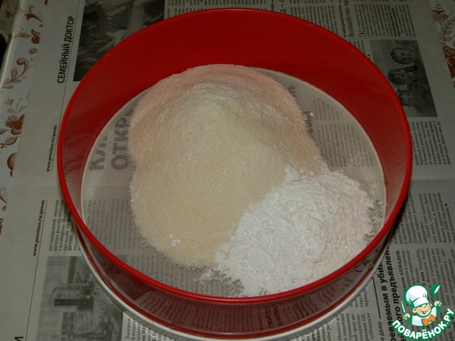 Итак, просеять рисовую муку вместе с крахмалом, мукой и разрыхлителем.