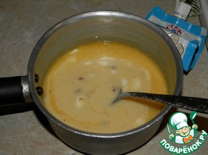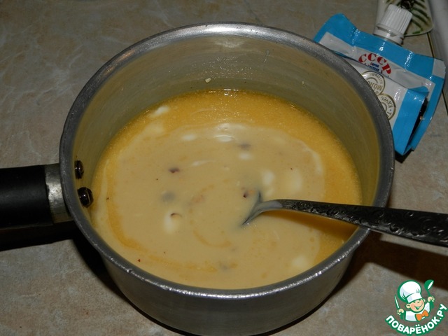 • В растопленную массу добавить сгущёнку, сметану и ванилин.