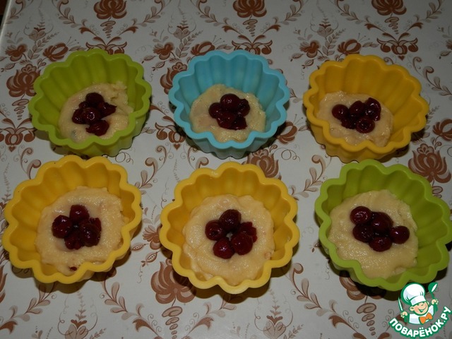 • Разложить половину теста по формочкам, сверху положить начинку из вишен без косточек.