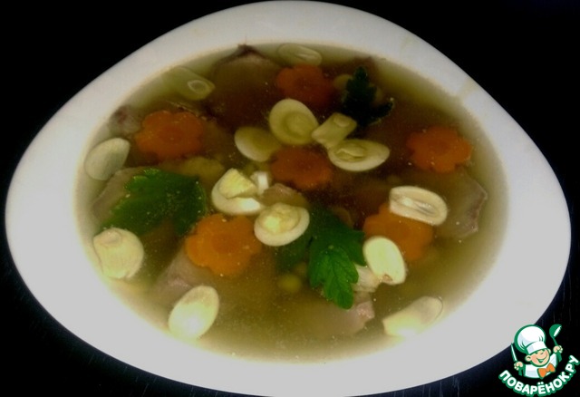 Бульон в заливном должен быть абсолютно прозрачным, без звездочек жира, иметь мясной вкус и насыщенный аромат пряностей (черный перец горошком и лавровый лист).