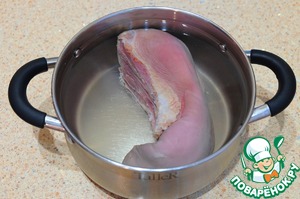 Говяжий язык промыть, удалить лишний жир, залить холодной водой, поставить на сильный огонь