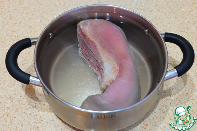 Язык, пока он еще теплый, нужно почистить, снять покровные пленки, удалить остатки жира, далее поместить в емкость, накрыть пищевой пленкой и поставить на холод до полного остывания.