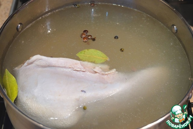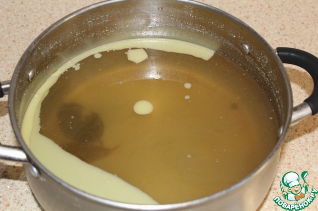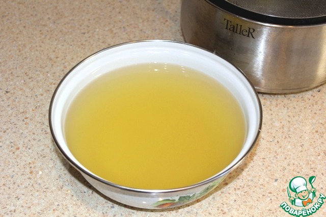 Бульон вынести на холод или поставить в холодильник для того, чтобы образовавшийся в процессе варки жир оказался на поверхности (в заливном его быть не должно!)